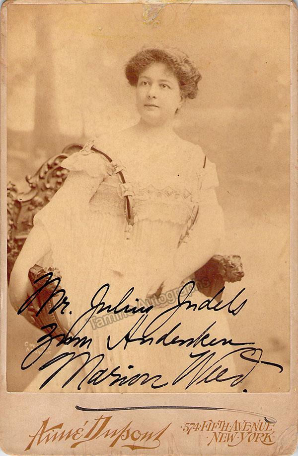 Signed cabinet photo, shown probably as herself, photo by Aime Dupont, New York, inscribed. Size is 4.25 x 6.5 inches, in very good condition.