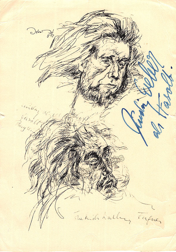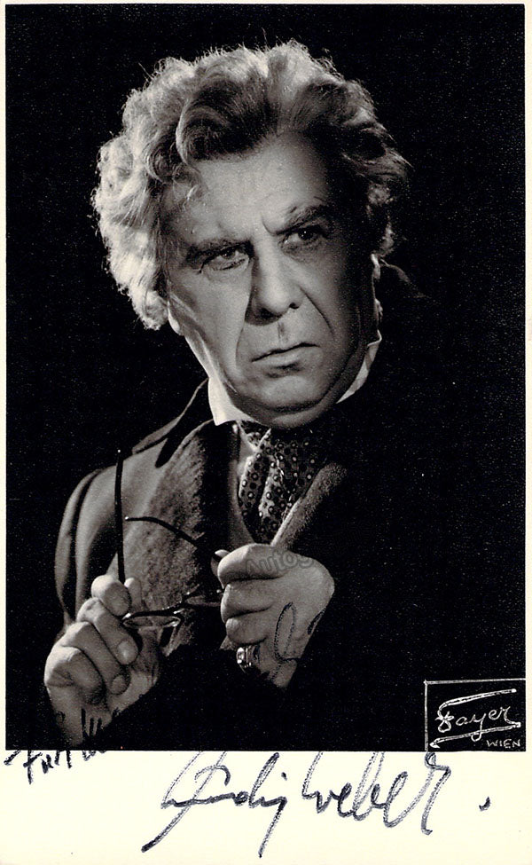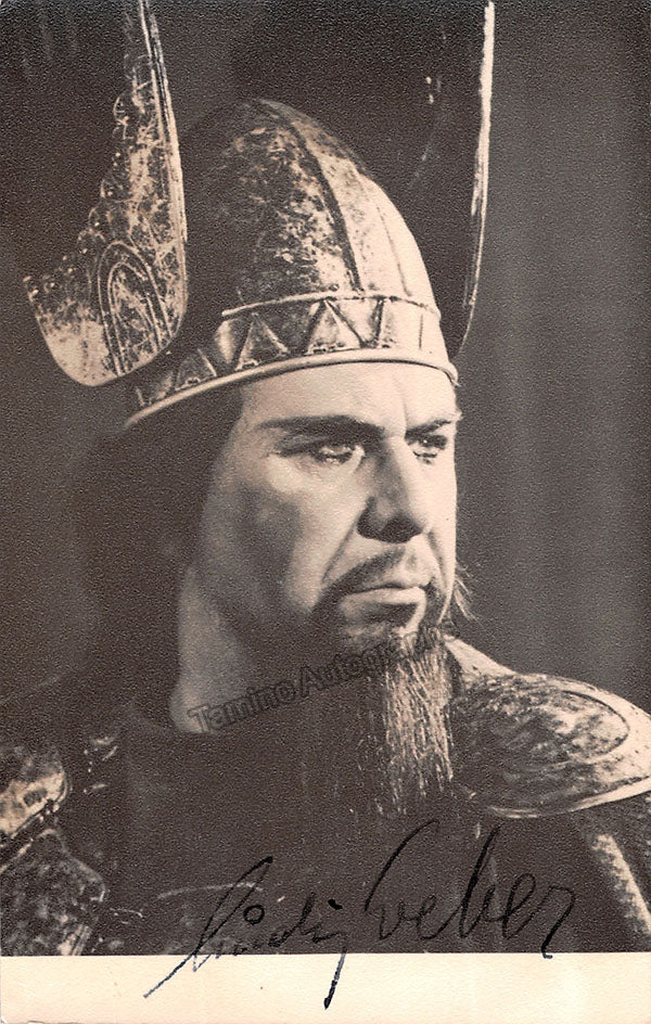 Nice printed portrait of Weber as Fasolt in Wagner's Das Rheingold on soft cardboard signed by him adding the characters portrayed. Size is 4.4 x 6.4 inches, evident creases over borders, tape residues on verso, in overall good condition.