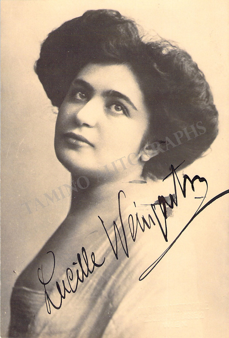 American mezzo-soprano (1877-1921), wife of the famous Austrian conductor Felix Weingartner. Signed postcard photograph, shown as herself, bold handwriting and signature. Blind stamped on front by Magasin Metropole photo studio, Vienna. Size is 3.5 x 5.25 inches, in excellent condition.