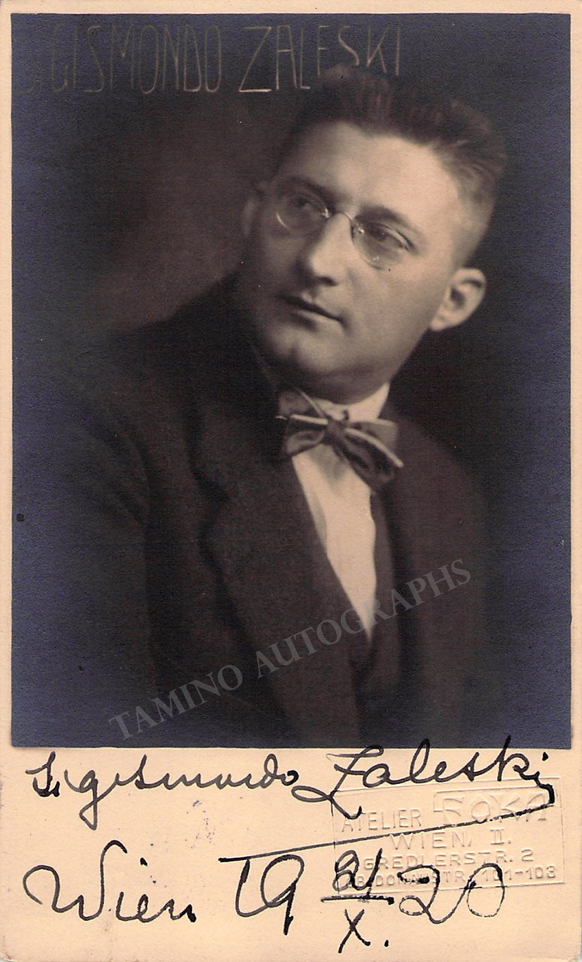 Nice black-and-white photograph signed by him, shown young, dated in Vienna, 1920; photo is blind-stamped on the front by photographer Atelier Foka, Vienna. Size is 3.2 x 5.25 inches, in excellent condition.