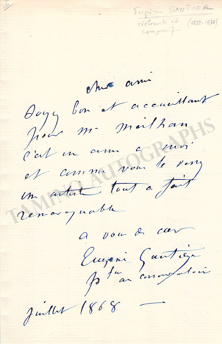 Autograph letter in French signed by him, dated July 1868, to a gentleman, recommending his friend the pianist and composer Jules Meilhan "... He is a friend of mine and, as you will see, a quite remarkable artist...". Size is 5.2 x 8.1 inches, 1 page, overall rust tone, light smudge over ink, in overall excellent condition.
