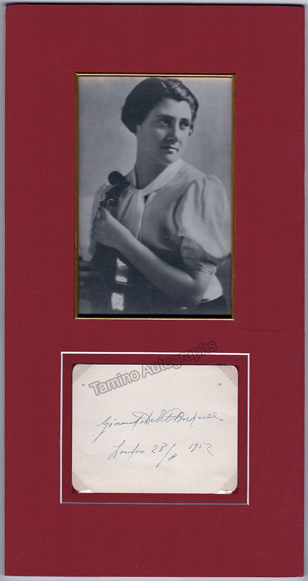 Signed album page dated in London, 1952, beautifully matted with a portrait of her.  Total size is 8.1 x 15.5 inches (album page is 4.5 x 3.5 inches, portrait is 4.1 x 6.5 inches -visible window size), in very good condition.