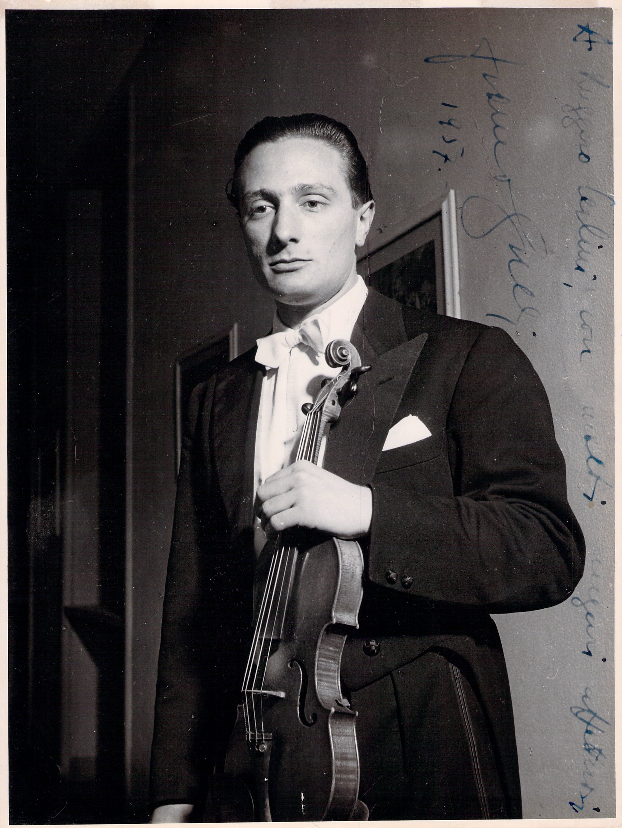 Famous Italian violinist (1926-2001), one of the greatest italian violinists of the 20th century. Rare signed photo, shown young, inscribed with a short sentiment, dated by him in 1957, at age 31.