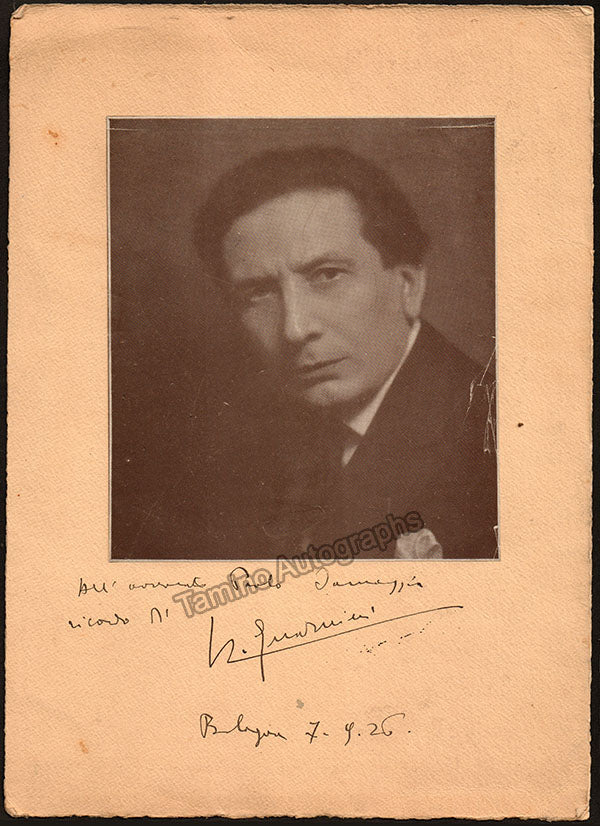 Signed photograph, inscribed by him dated in Bologna in 1926.  Photo size is 6.5 x 7.5 inches, mounted on cardboard (signature is on the cardboard directly beneath the photo), total item size is 9.75 x 14 inches, with some creases at the bottom corners of the cardboard, otherwise in good condition.