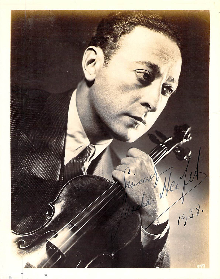 Fine black-and-white photograph signed and inscribed by him, dated 1986, shown at a young age tunning his violin, mounted on a slightly larger piece of black hard cardboard. Size is 9.3 x 7.4 inches, in excellent condition.