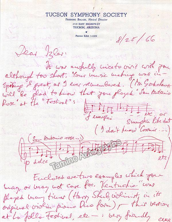 Hungarian-born violinist and conductor (1920-2018) of the Tucson Symphony Orchestra. Autograph letter signed with letterhead of the TSO, about music issues. 2 pages in one sheet. Size is 8.5 x 10.9 inches, in very good condition.