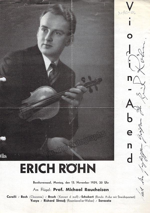 German violinist (1910-1985), who was the concert master of the Berliner Philharmoniker in the Furtwangler era. Signed playbill announcing a concert as a soloist in 1939. One sheet sized 8 x 11.5 inches, storage holes and folds and minor cracks at the top, otherwise in good condition.