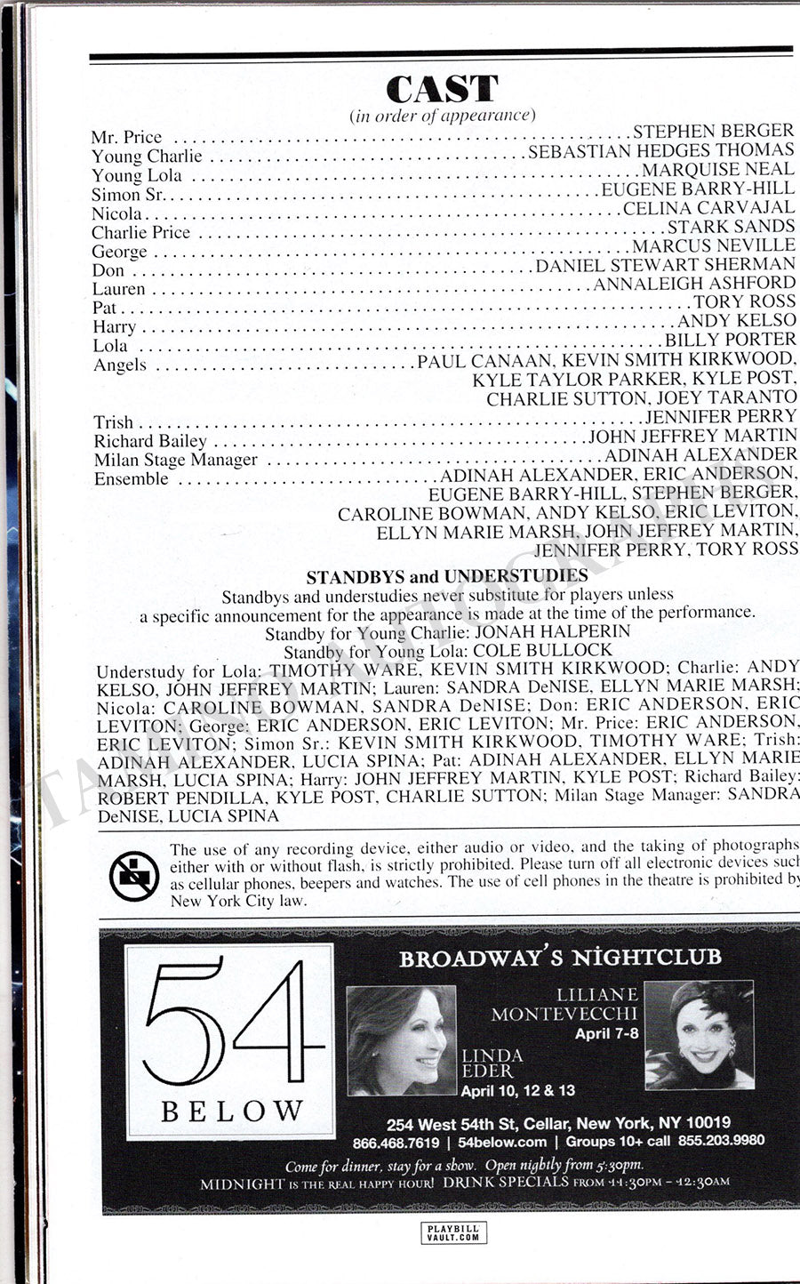 Original playbill for a Broadway production of the musical Kinky Boots by Al Hirschfeld Theatre; featuring Stephen Berger, Sebastian Hedges, Marquise Neal, Stark Sands, Marcus Neville, Tory Ross, Andy Kelson, and others; signed by most of the cast.