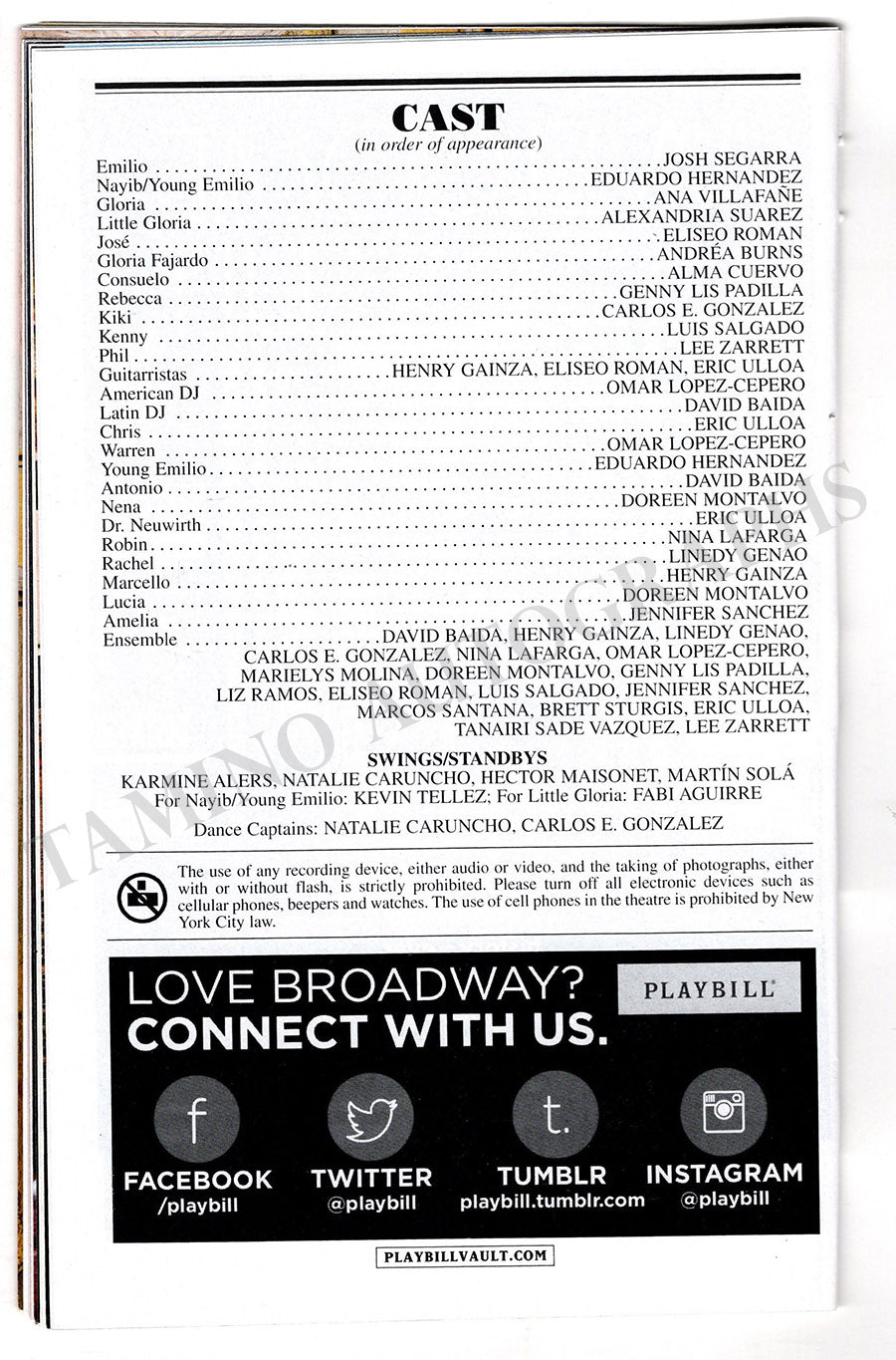 Original playbill for a Broadway production of the musical On Your Fee! at the Marquis Theatre, featuring Josh Segarra, Eduardo Hernandez, Ana Villafañe, Alexandria Suarez, and others; signed by members of the cast.