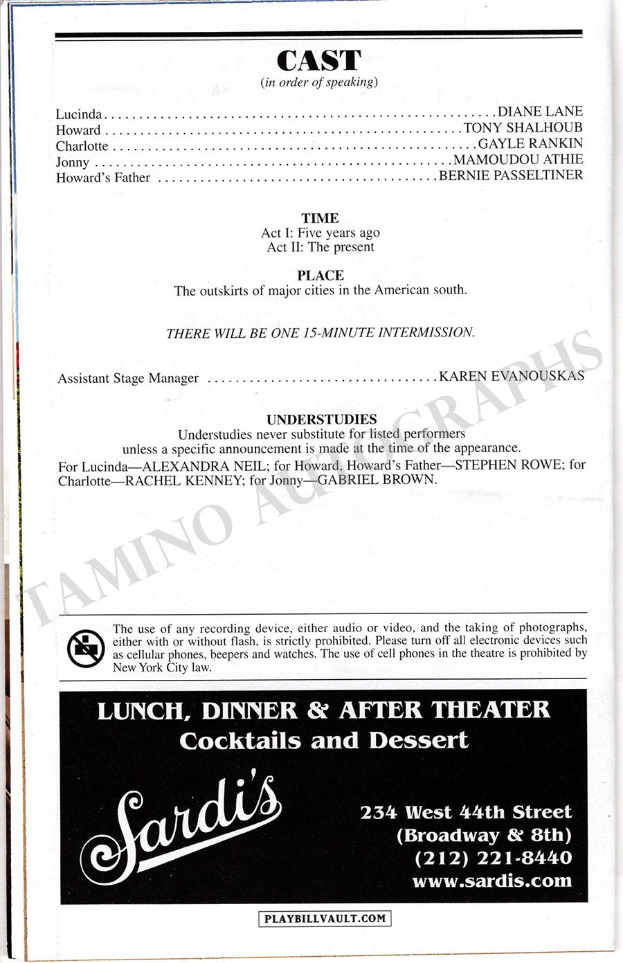 Original playbill for a Broadway production of the musical The Mistery of Love & Sex at Licoln Center Theatre at the Mitzi E. Newhouse, featuring Diane Lane, Tony Shalhoub, Gayle Rankin, Mamoudou Athie, and Bernie Passeltiner; signed by all members of the cast.