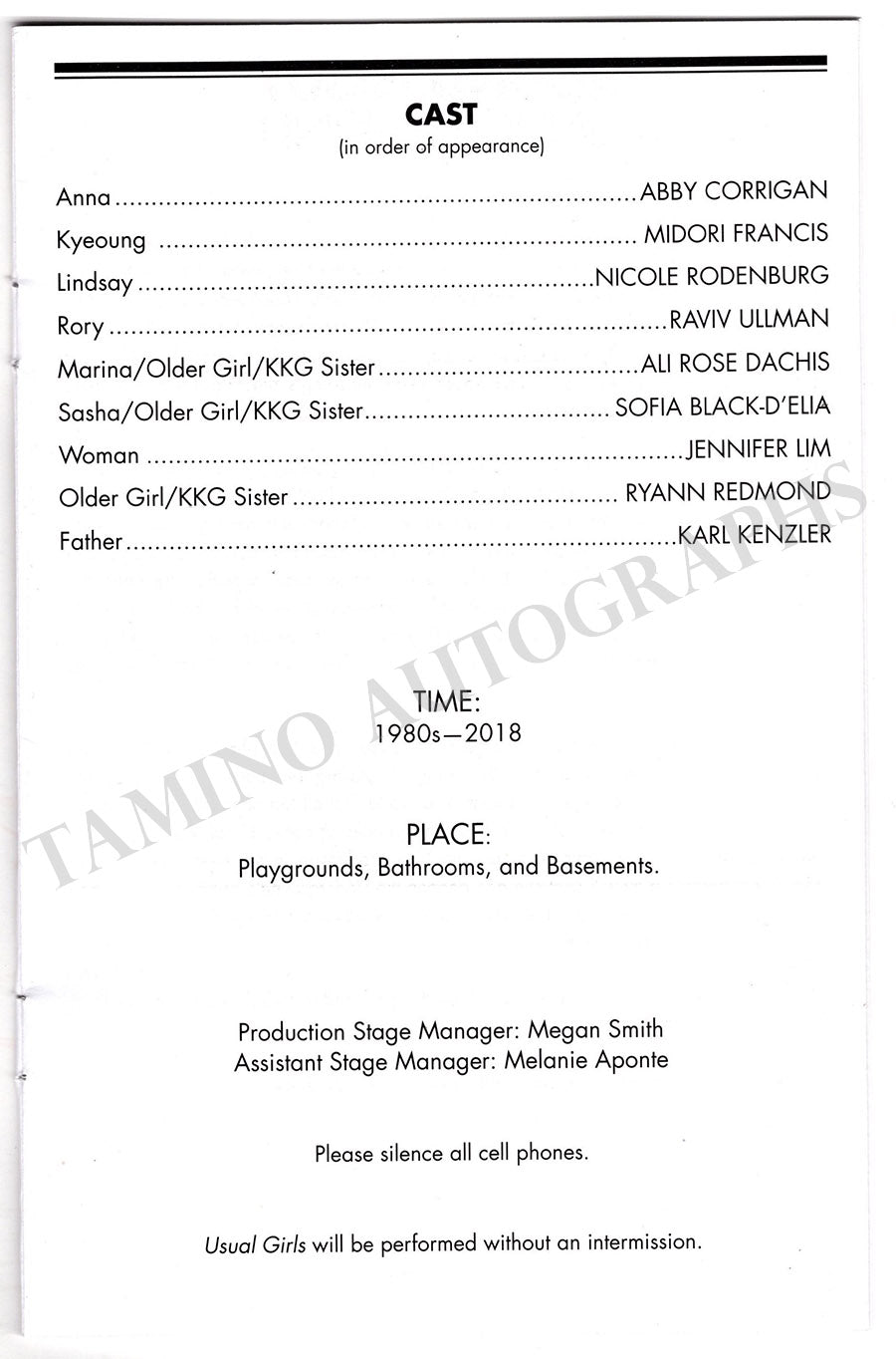 Original playbill for a Broadway production of the musical Usual Girls at Blackbox Theatre, featuring Abby Corrigan, Midori Francis, Nicole Rodenburg, Raviv Ullman, and others; signed by many members of the cast.