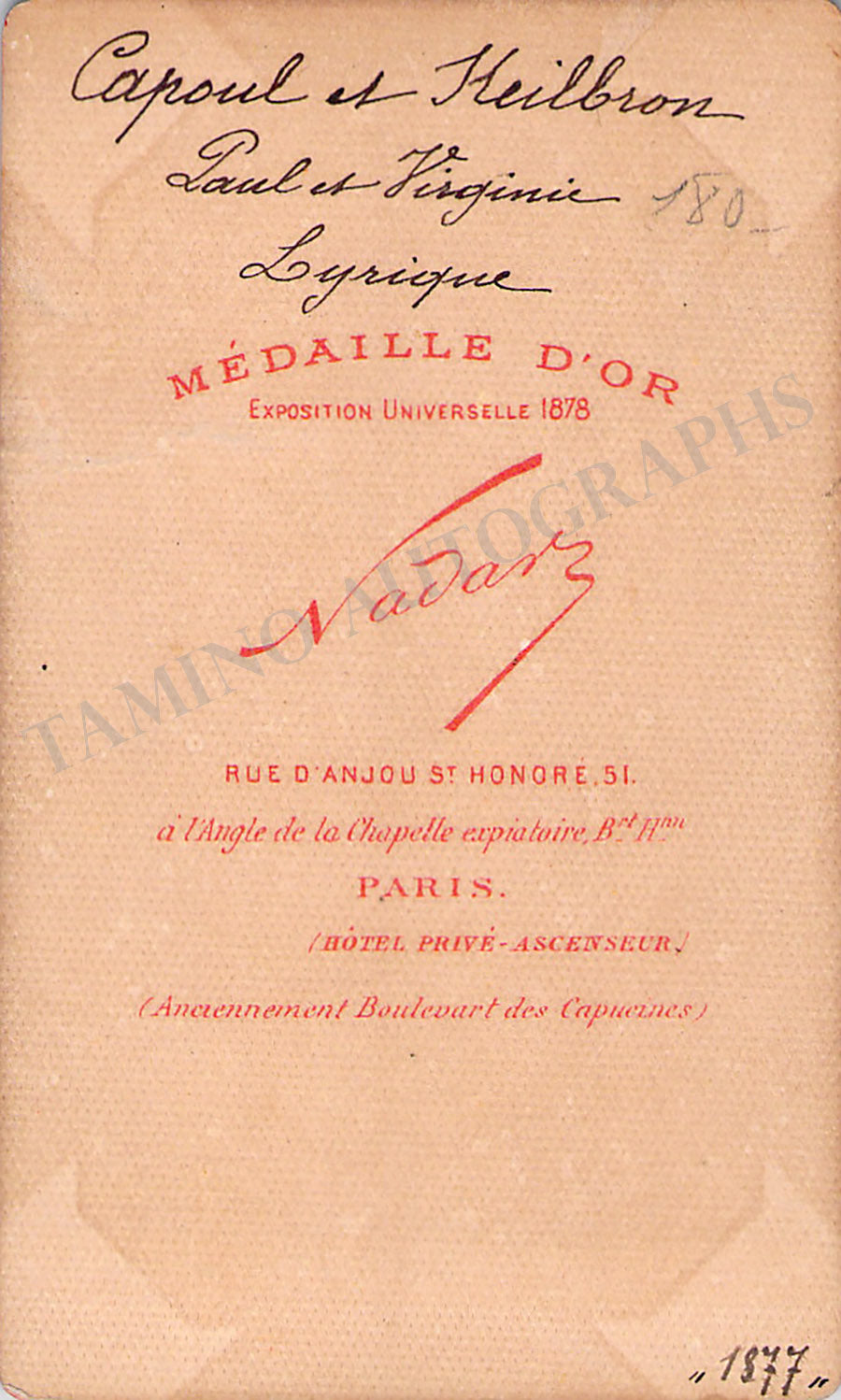 Beautiful vintage unsigned carte-de-visite CDV by Nadar (Paris) featuring Capoul and Heilbron in the world premiere of Victor Massé's opera Paul et Virginie in 1877. Size is 2.5 x 4.1 inches, in very good condition.