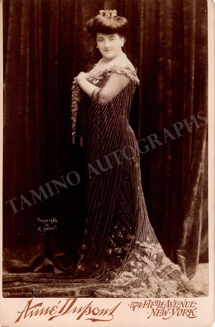 Unsigned cabinet photograph, shown as herself. Photo by Aime Dupont, New York. Size is 4.25 x 6.5 inches, sharp cuts/missing paper at top left and right and bottom right borders as well as to the left of the photo, discount reflected in price.