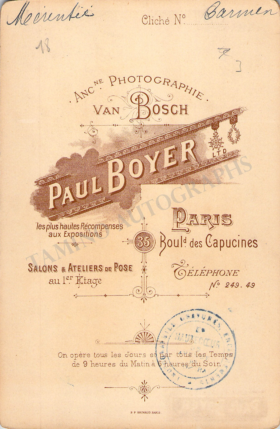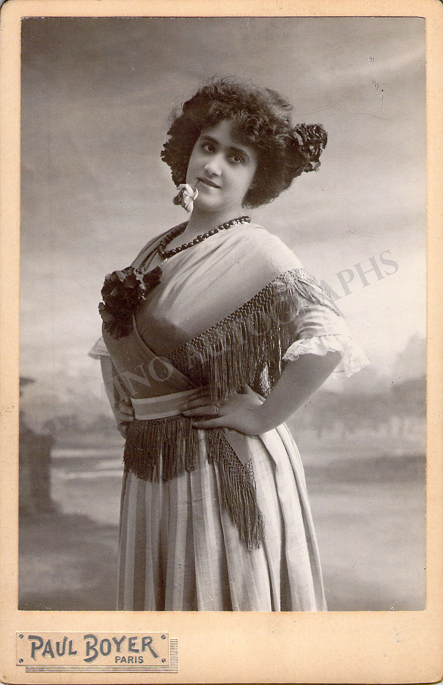 French soprano (1880-?), sang frequently in Paris from 1904 to about 1919. Unsigned cabinet photograph, shown in the title role of Bizet's Carmen, photo by Paul Boyer, Paris. Size is 4.25 x 6.5 inches, small penciled in markings on verso, otherwise in excellent condition.