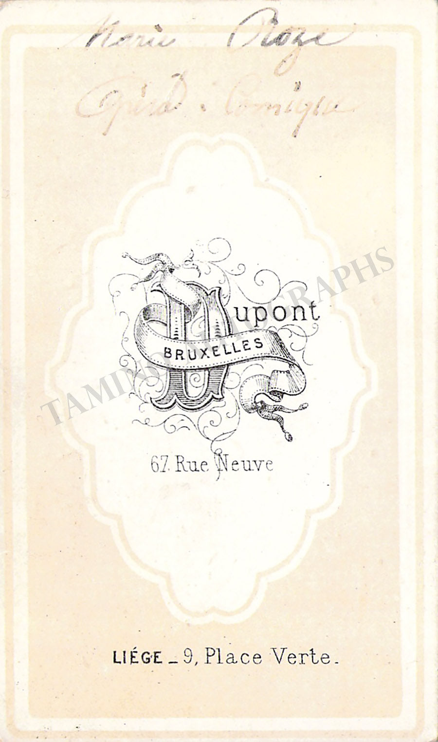 Unsigned CDV, shown as herself, photo by Dupont, Brussels. Size is 2.5 x 4.1 inches, pencil markings on verso, otherwise in excellent condition.