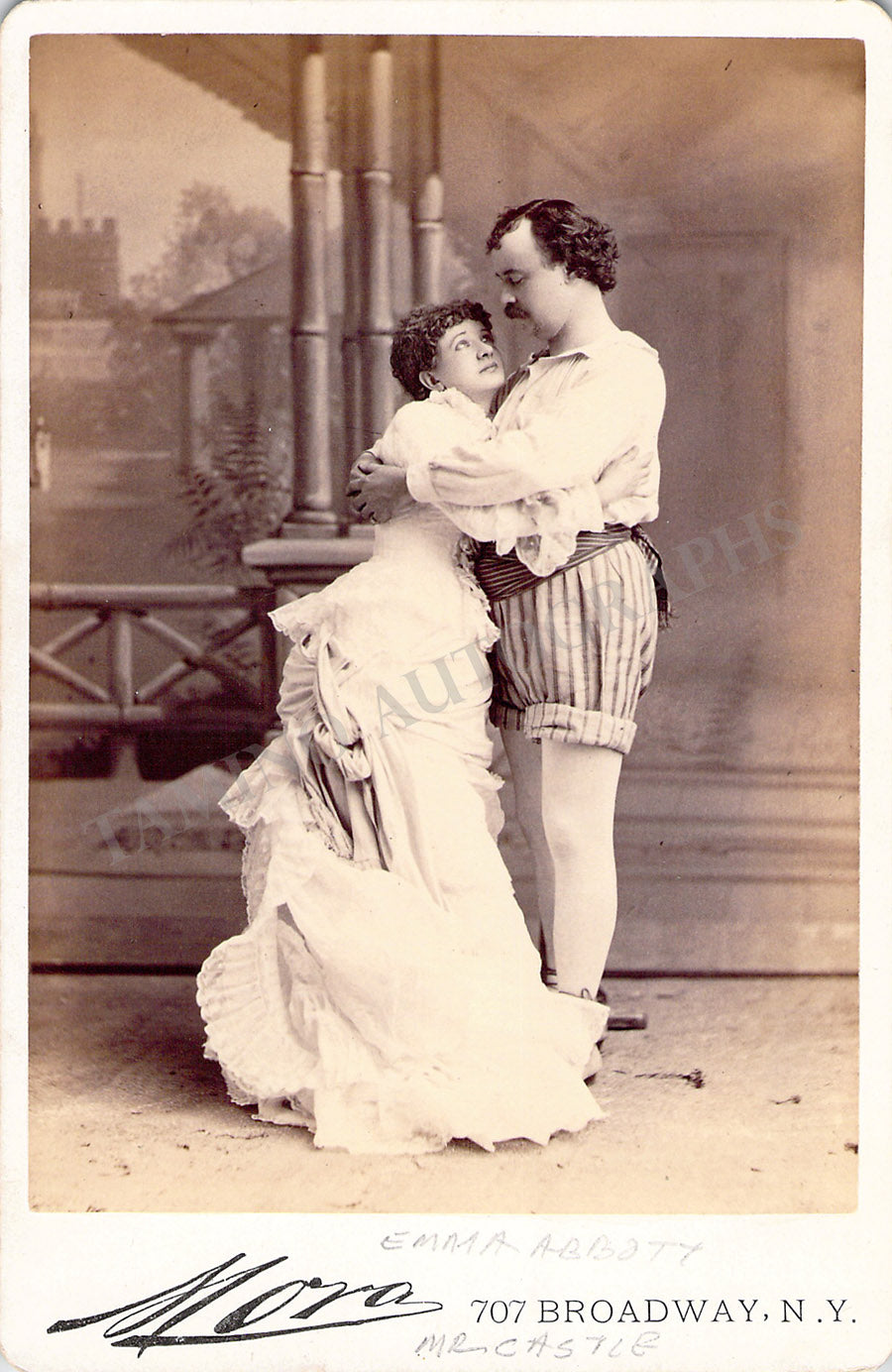 Unsigned cabinet photo of 2 artists in role, American soprano Emma Abbot (1850-1891), and English tenor William Castle (1836-1909). Original photo by Mora, New York. Size is 4.25 x 6.5 inches, in excellent condition.