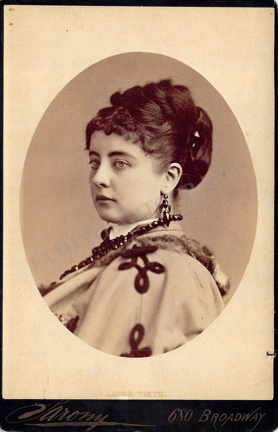 Unsigned cabinet photograph, shown as herself, a photo by Sarony, New York. Size is 4.25 x 6.25 inches, in very good condition.