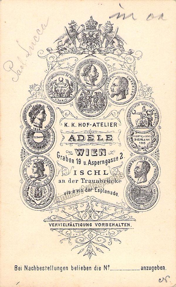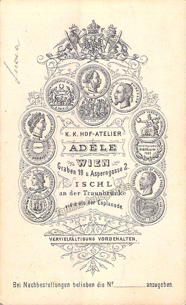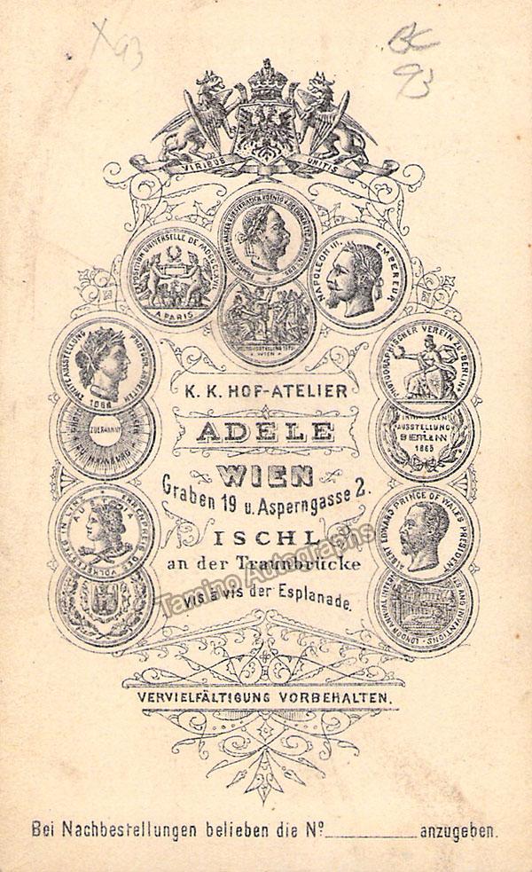 Unsigned CDV, shown as herself, a photo by Adele photographers, Vienna. Size is 2.5 x 4.1 inches, in excellent condition.