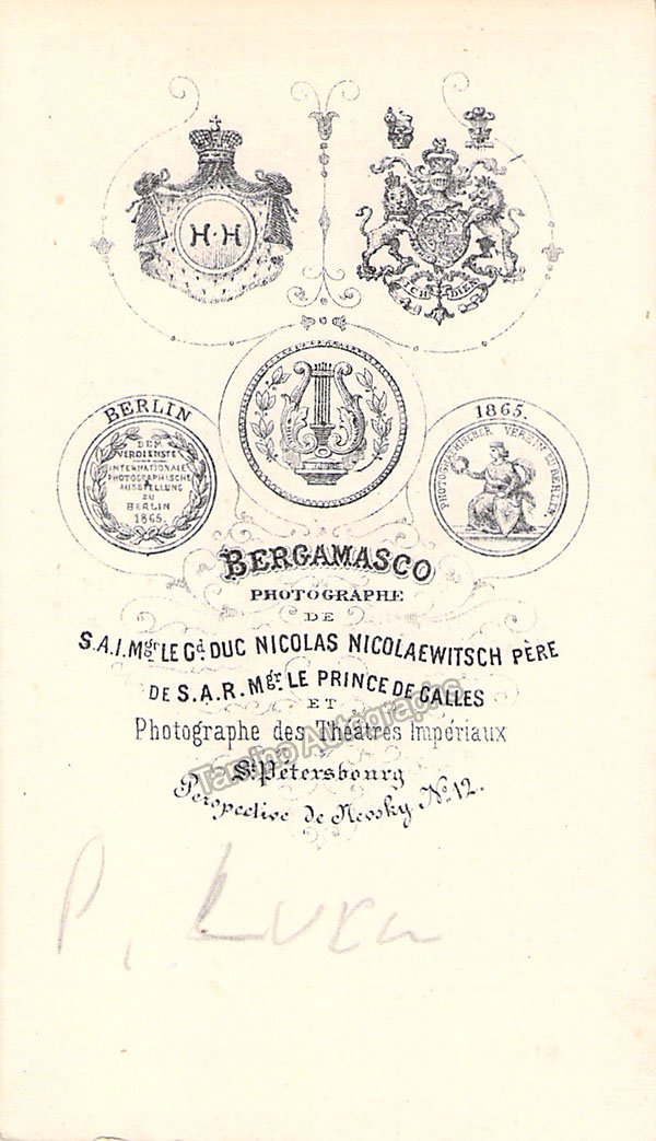 Unsigned CDV, shown in role. Photo by Bergamasco, St. Petersburg. Size is 2.4 x 4.25 inches, in excellent condition.
