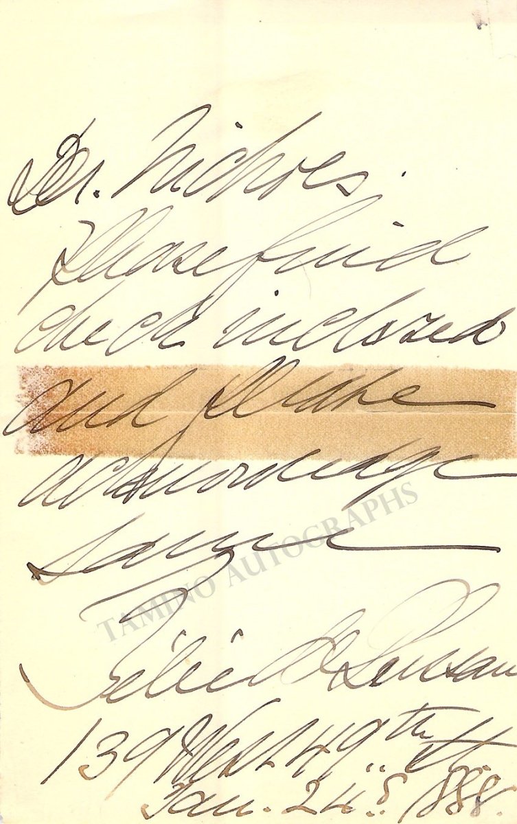 American soprano/mezzo soprano (1861-1949), autograph note signed, written in Engish, dated in 1888, one 4.5 x 7 inch page with scotch tape in the middle of the page and small rust on verso but in otherwise good condition.