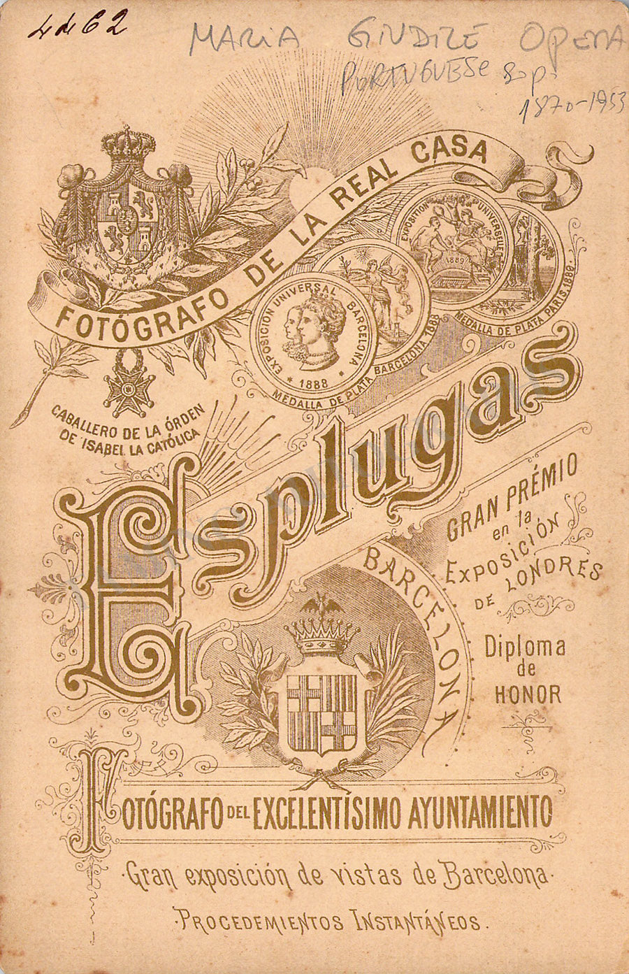 Original cabinet-style vintage (unsigned) photograph of the singer shown probably in role, by photographer Antoni Esplugas (Barcelona). Size is 4.25 x 6.5 inches, spotted rust stains on the front, verso with some ink markings, otherwise in excellent condition.
