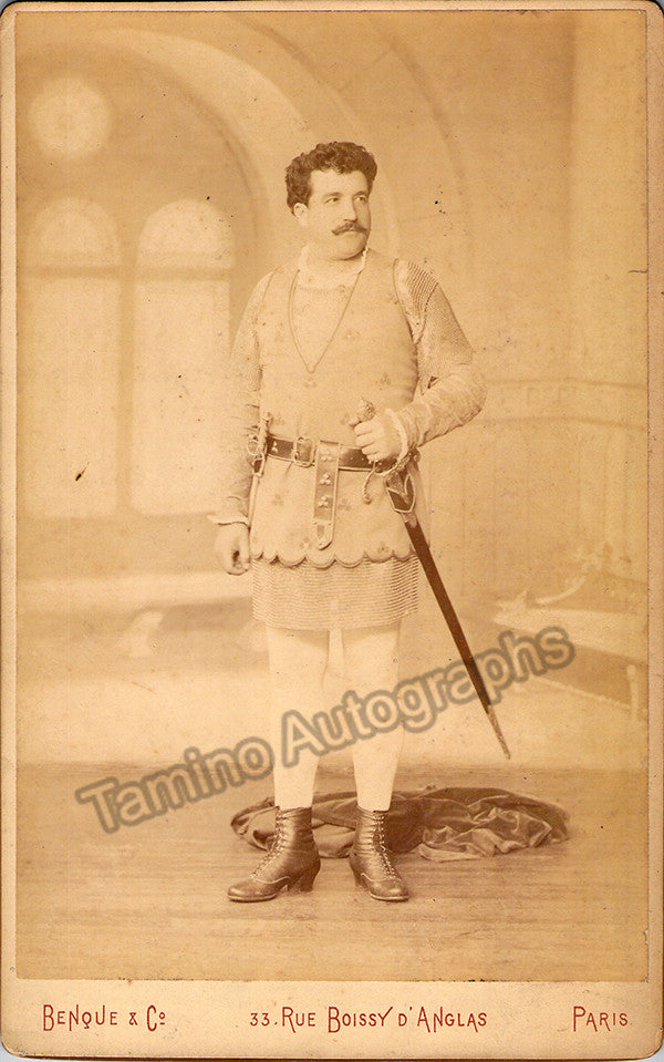 Large cabinet photo of the French tenor (1849-1899), shown as Manoel Diaz in Le Tribut de Zamora (opera by Gounod), a role he created in the 1881 world premiere!.