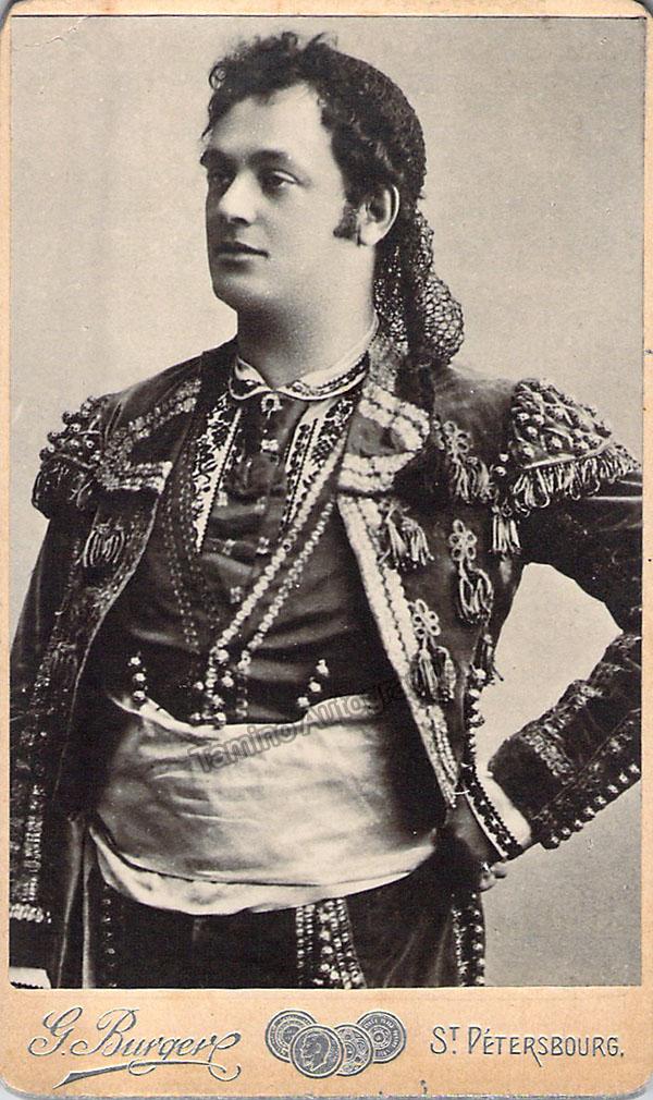 Unsigned mini-cabinet photo, shown as Escamillio in Bizet's Carmen. Photo by G. Burger. Size is 2.4 x 4 inches, in excellent condition.