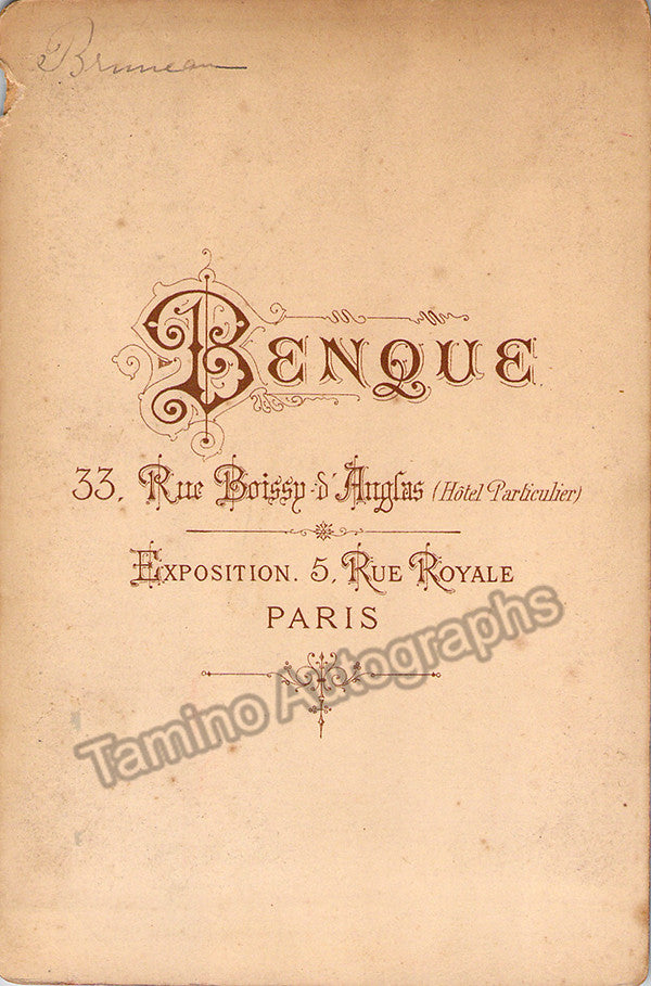 Nice unsigned cabinet photo of the French composer (1857-1934), 4.25 x 6.5 inches. Photo by Benque, Paris, missing a very small piece over the upper right corner, not affecting the image, otherwise in excellent condition