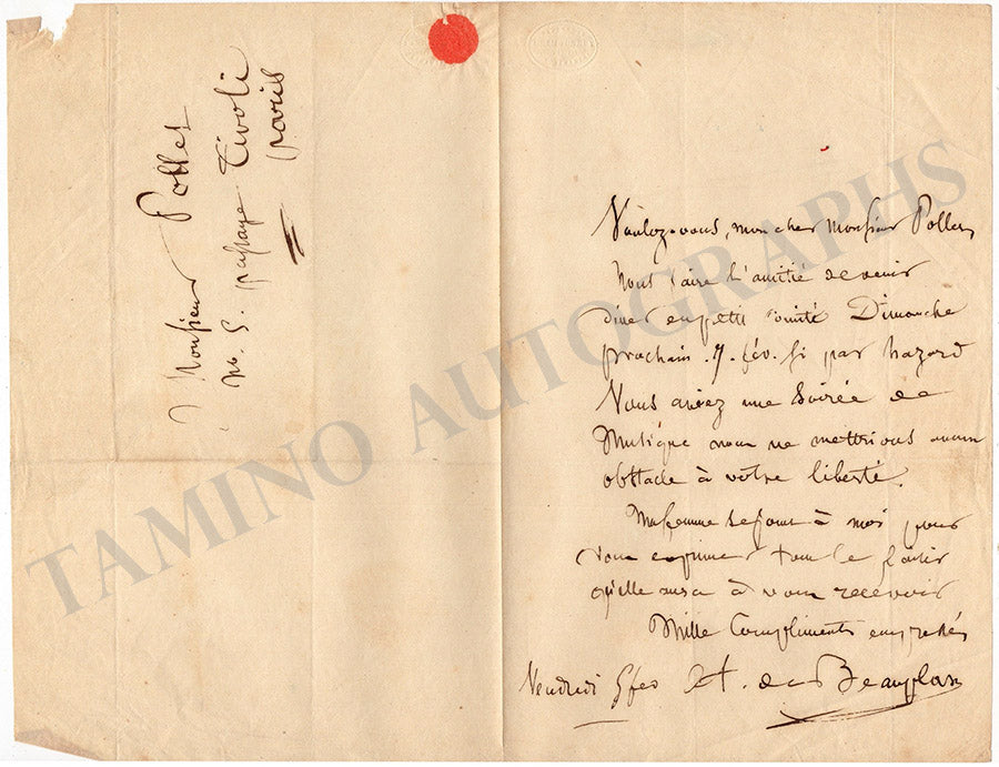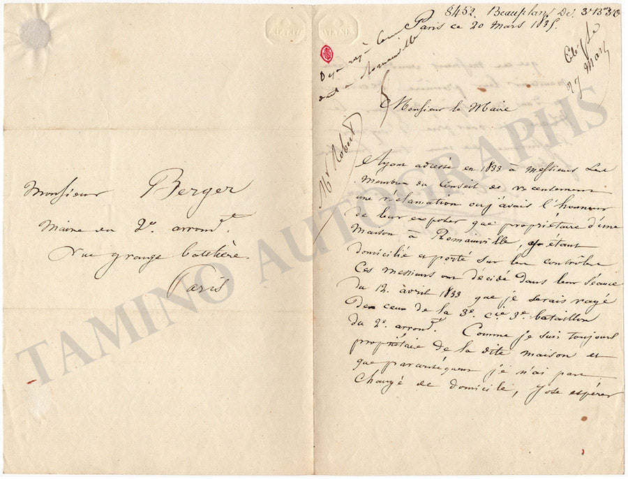 Set of two autograph letters in French (untranslated) signed by him, one of them dated 1835, where he addresses two gentlemen, concerning an invitation to dinner and a discussion on some property rights over a house in Romainville.