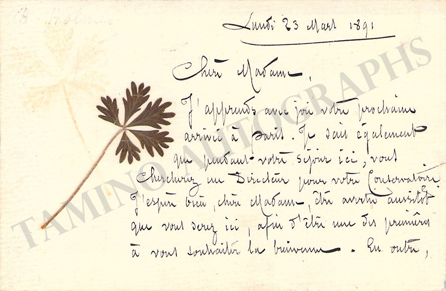 Autograph letter in French (untranslated) on a card signed by her and dated 1891. Size is 5.25 x 3.5 inches, written on both sides of the card, jagged edges, in very good condition.