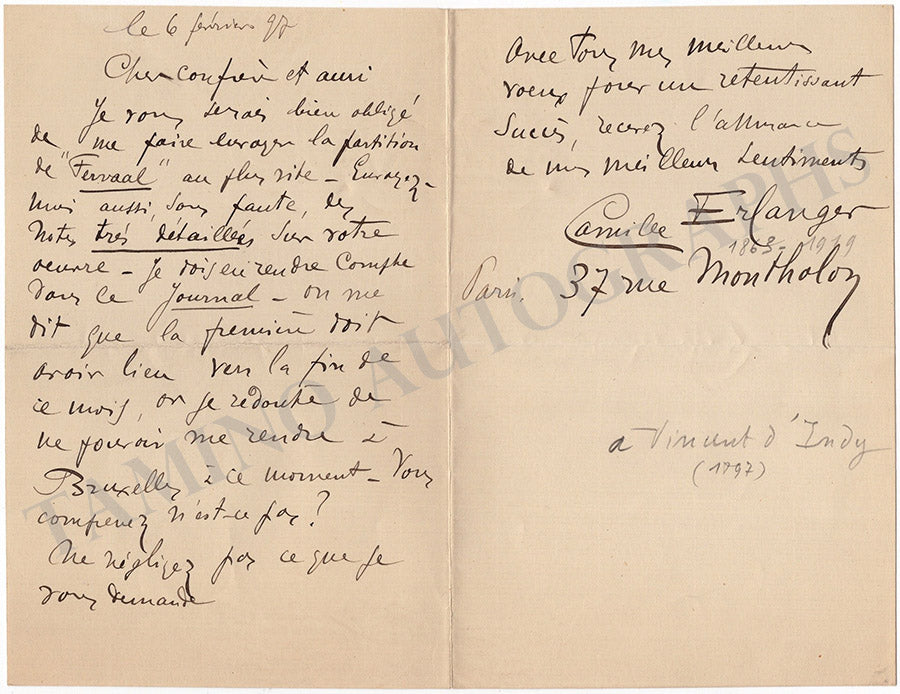 Autograph letter in French (untranslated) signed by him, dated 1897, addressed to the composer Vincent d’Indy, concerning the latter’s work “Fervaal” (1897): “…Je vous serai bien obligé de me faire envoyer la partition de “Fervaal” au plus vite – Envoyez moi aussi, sans faute, les notes très detaillés sur votre oeuvre…”