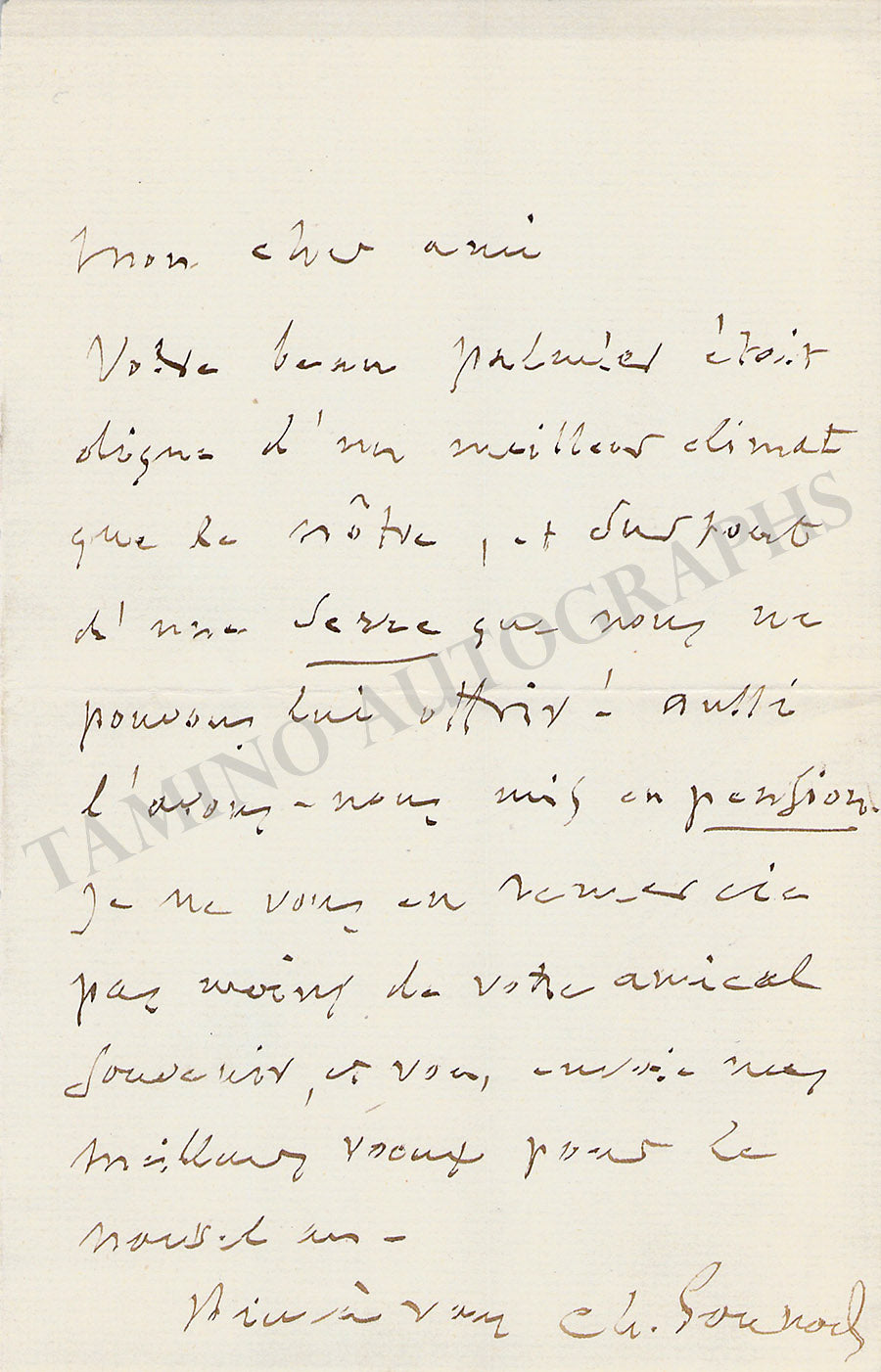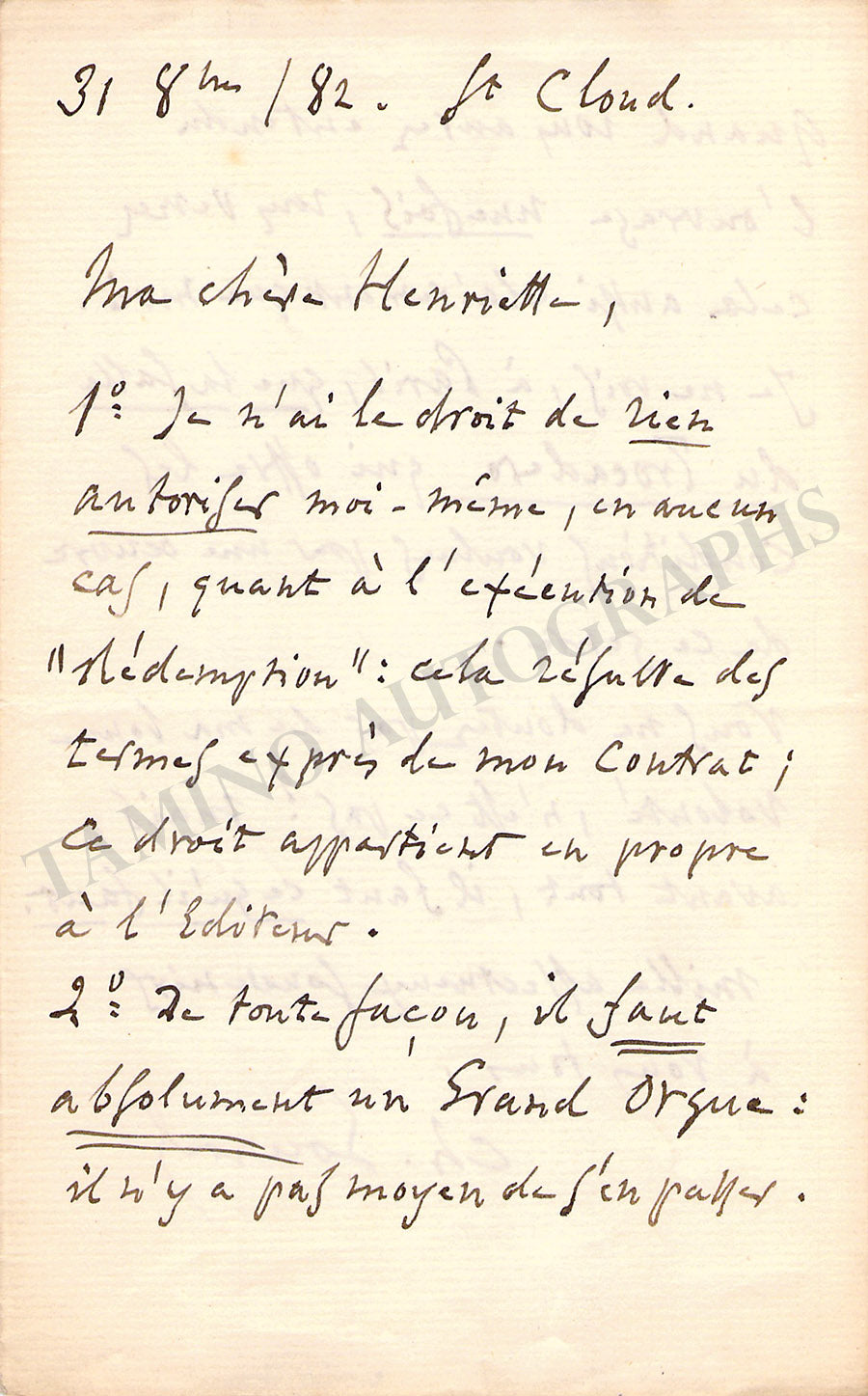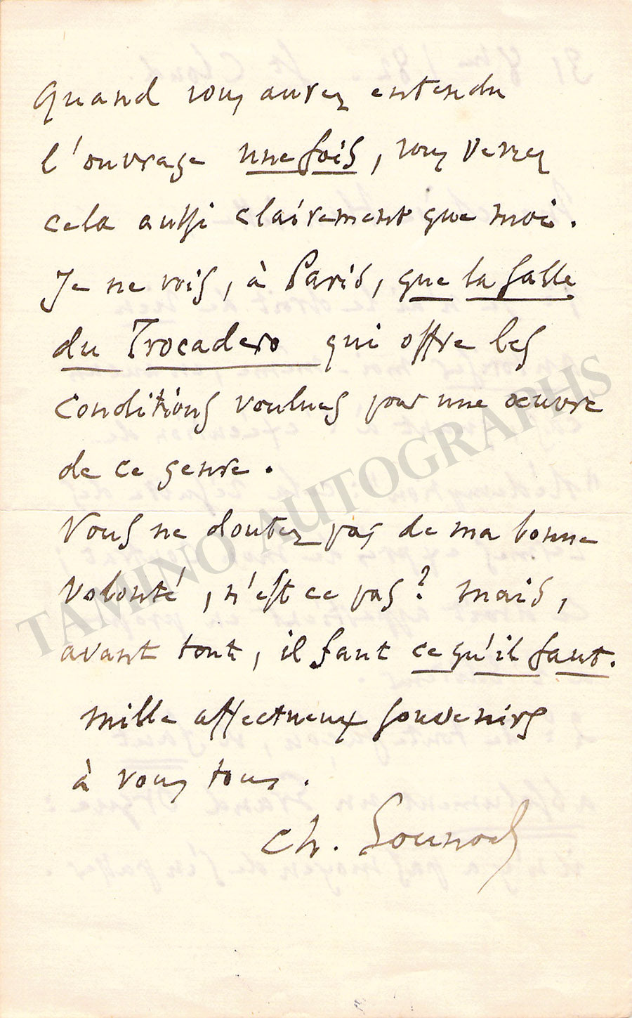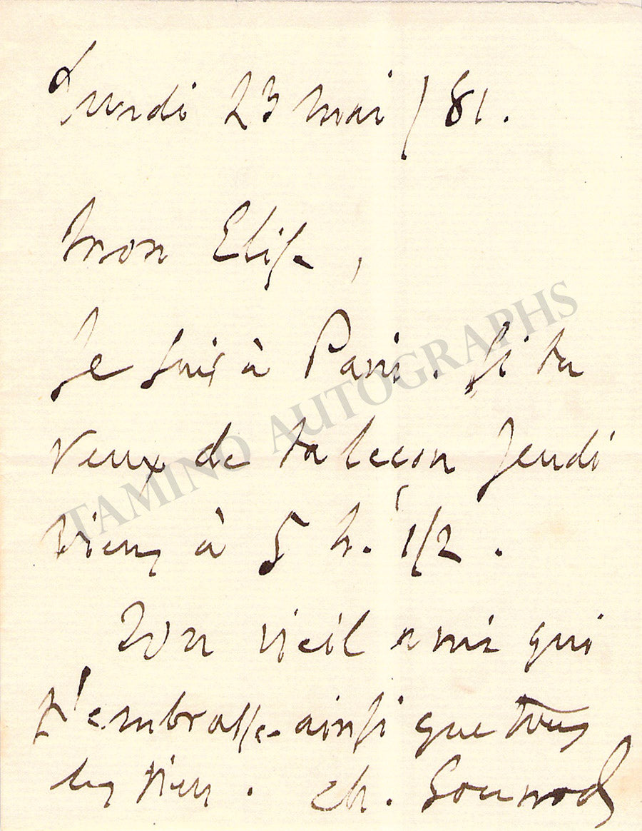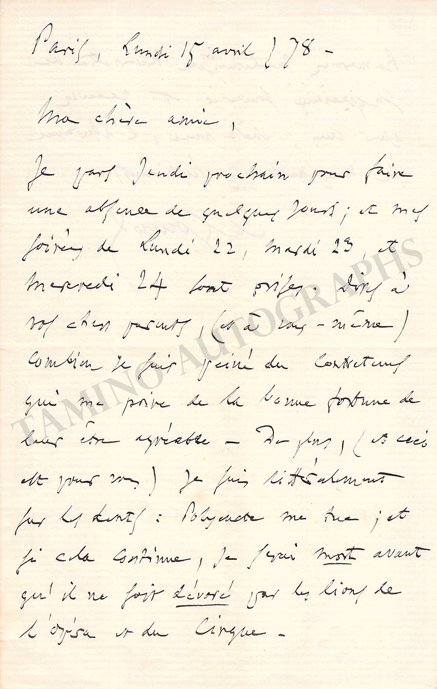 Autograph letter in French (untranslated) signed by the composer in Paris, 1878. Size is 5.1 x 8.1 inches, 2 written pages in 1 sheet, central fold, in excellent condition.