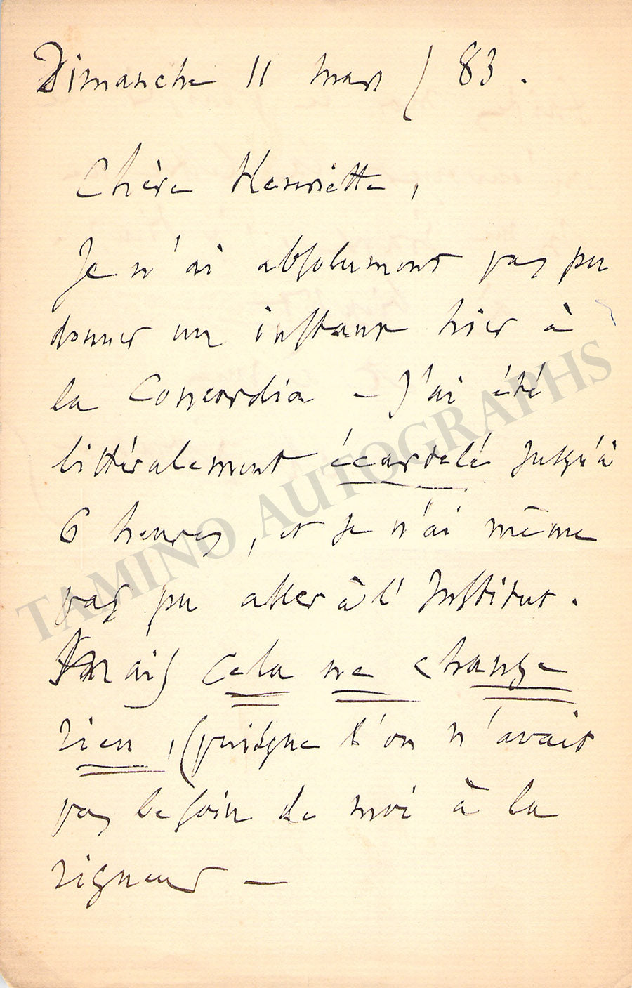 Autograph letter in French (untranslated) signed by him in March 1883. Size is 43 x 6.9 inches, 2 written pages in 1 folded sheet, in excellent condition.