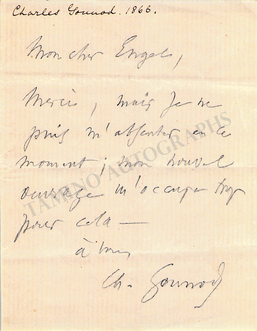 Autograph note in French (sold untranslated) signed by the composer and dated at the top by another hand in 1866. Size is 4.1 x 5.25 inches, 1 page, folds, otherwise in excellent condition.
