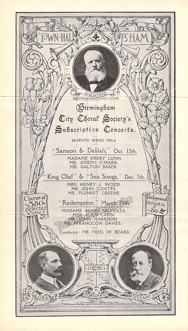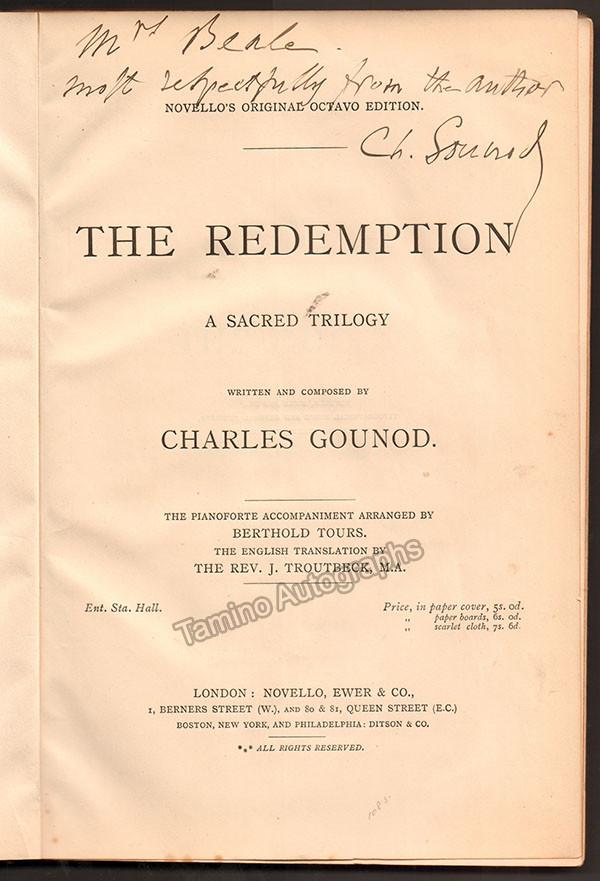 First English edition of the score, printed by Novello (1882), of this oratorio by Charles Gounod. Signed by Gounod on the first page, score book comes with a program from the Birmingham Choral Society for a performance of The Redemption in 1905-06. The Birmingham Choral Society world premiered this oratorio in Birmingham in 1882. Score is 7 x 9.9 inches, 174 pages, in excellent condition, playbill is 4.9 x 8.5 inches - see scans.