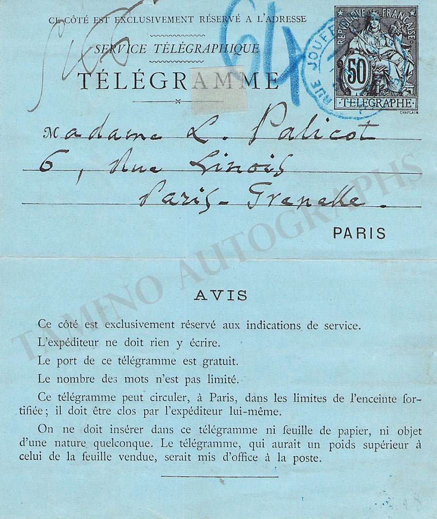 Autograph note in French (untranslated) signed by him in 1882. Size is 4.3 x 7 inches, 2 written pages in 1 folded sheet, in very good condition.