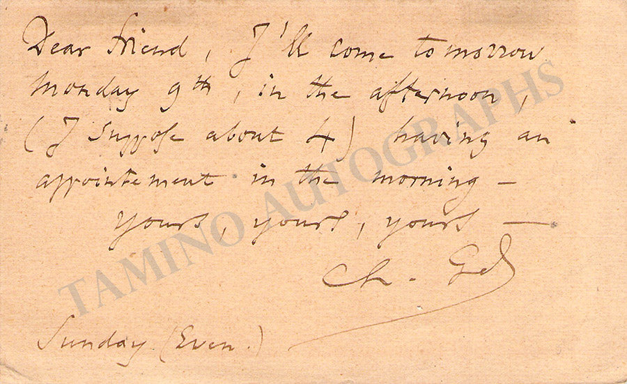 Autograph note on a card, dated March 12th, 1882. Size is 4 x 3.1 inches, in excellent condition.