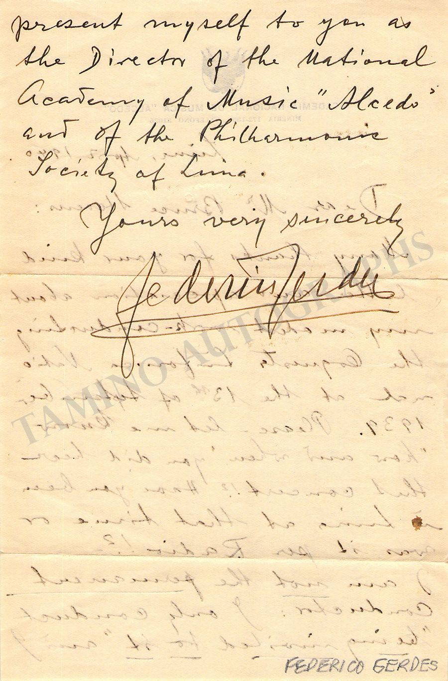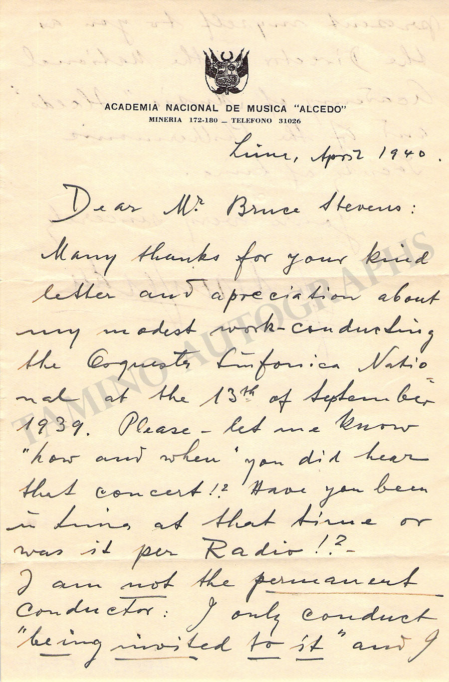 Autograph letter in English with the letterhead of the Academia Nacional de Música "Alcedo" signed by him, dated in Lima, 1940. Size is 5.5 x 8.5 inches, 1 page written on both sides, in excellent condition.
