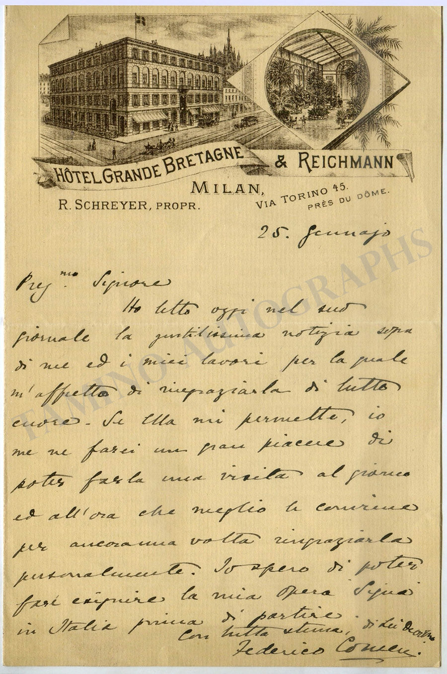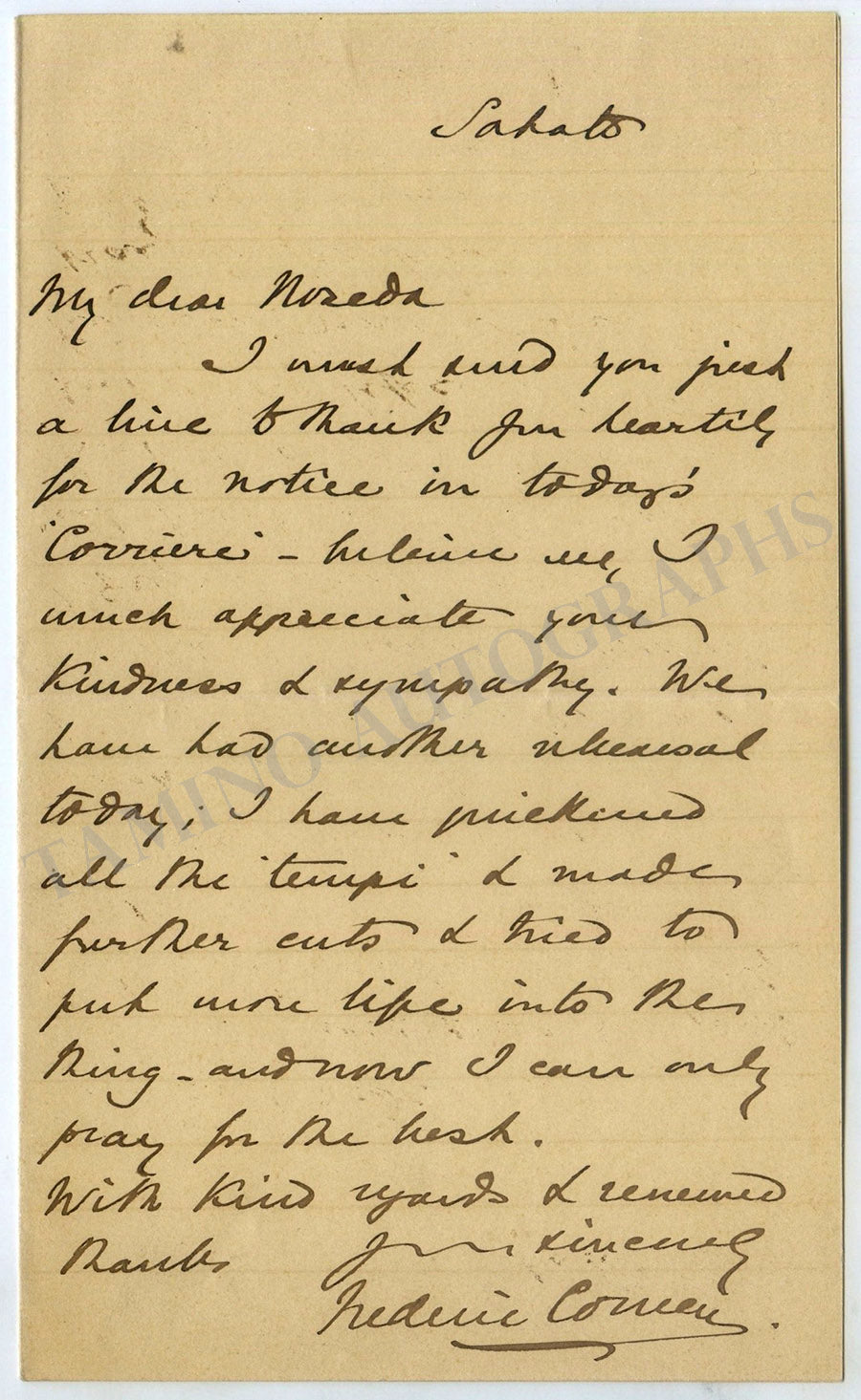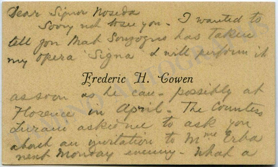 Signa is an opera originally conceived in four acts with music by the British composer with a libretto by Gilbert Arthur à Beckett, after Ouida, with an Italian translation by Giannandrea Mazzucato, first performed in a reduced three-act version at the Teatro Dal Verme, Milan on 12 November 1893. It was later given in a two-act version at Covent Garden, London on 30 June 1894. 2 pp. on visiting card.