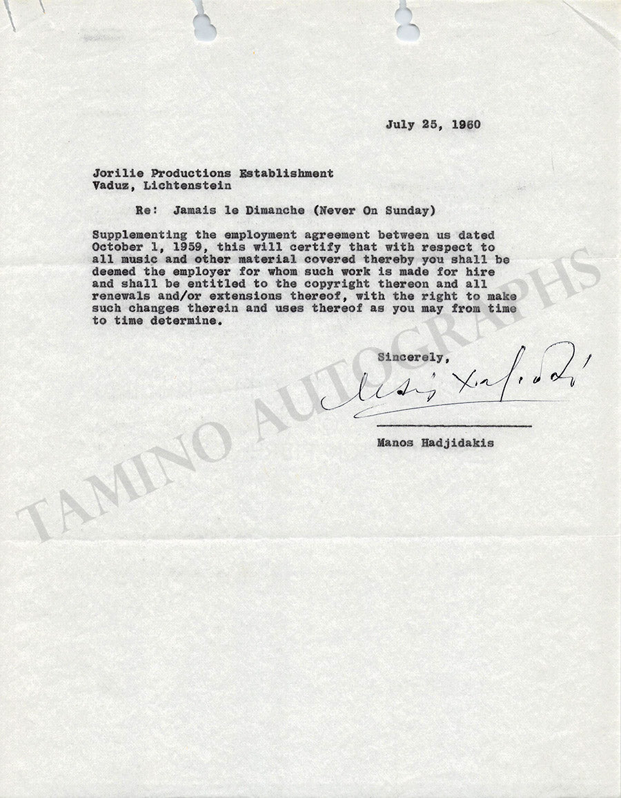 Hadjidakis, Manos - Typed Letter Signed 1960
