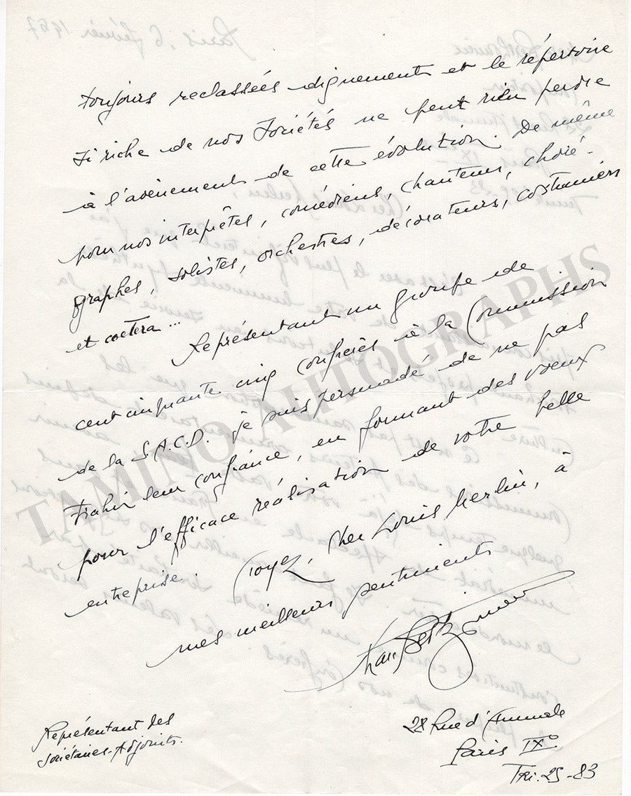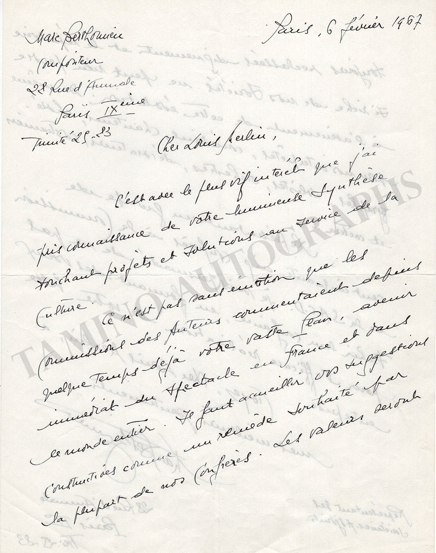 A. Paris, February 6, 1967. “…C’est avec le plus vif intérêt que j’ai pris connaissance de votre lumineuse synthèse touchant projets et solutions au service de la culture…”. 2 pp. In-4.