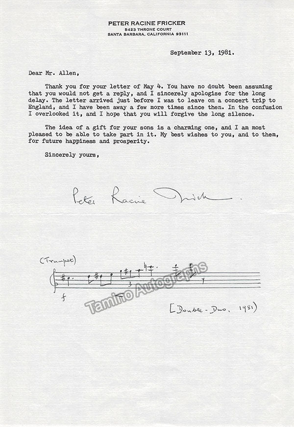 Fricker, Peter Racine - Typed Letter Signed with Music Quote 1981