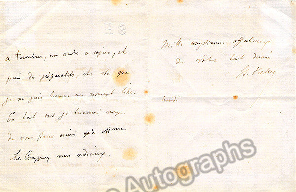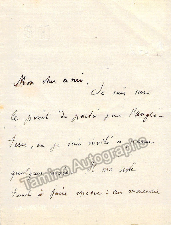 Autograph note signed by him, in one folded sheet, handwritten on both sides, showing blind letterhead with his initial on the first page. See scans. Heller writes to a friend (prob. composer Felix LeCouppey) mentioning he is about to leave for a visit to England, that he has been so busy finishing new compositions that he did not have a single free moment. He asks to give his regards to Mrs. LeCouppey and signs as St. Heller at the end.