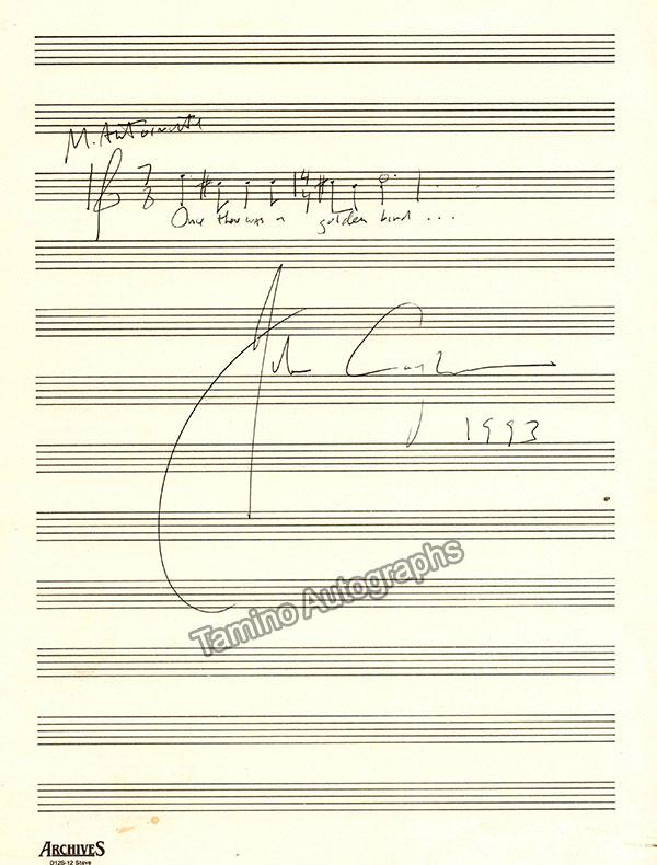 Autograph music quote signed by him in 1933, with two bars from the aria "Once there was a golden bird" from his opera "The Ghosts of Versailles".  Size is 9.5 x 12.25 inches, in excellent condition.