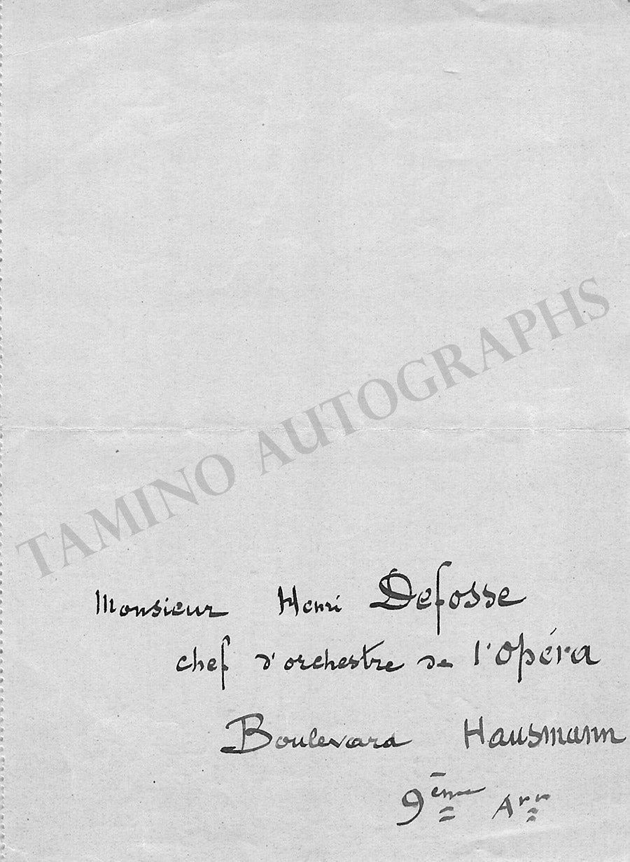 Autograph letter in French (untranslated) signed by him, dated August 24, no year indicated, addressed to the French conductor and composer Henri Defossé (1883-1956), conductor at the Opéra: