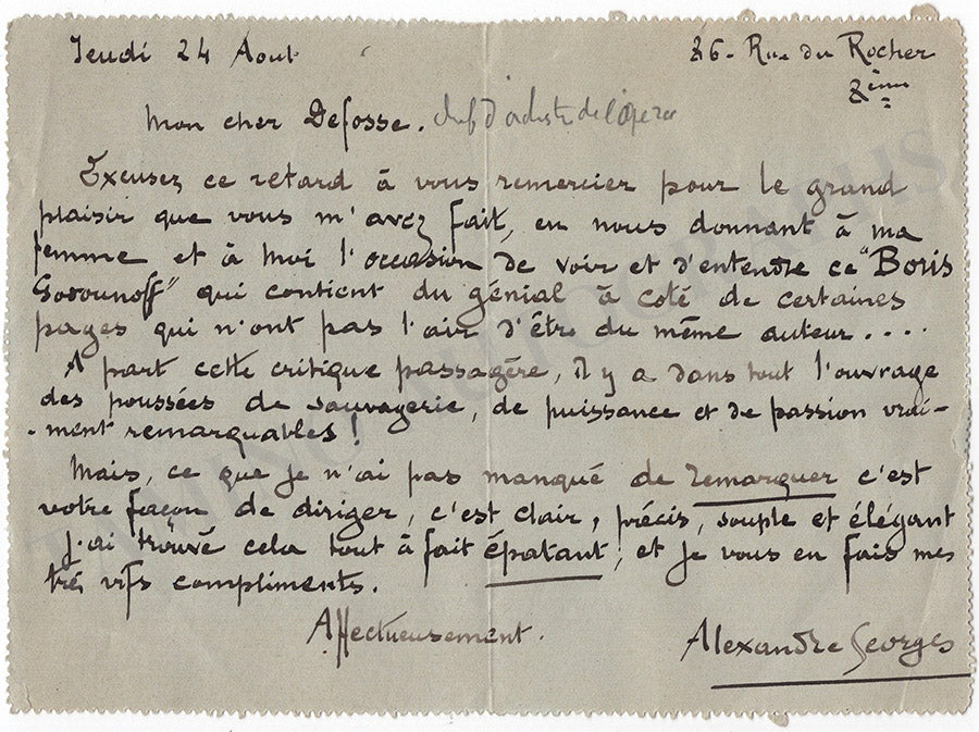 “…Excusez ce retard à vous remercier pour le grand plaisir que vous m’avez fait, en nous donnant à ma femme et à moi l’occasion de voir et entendre ce ‘Boris Godounoff’ qui contient du génial à coté de certaines pages qui n’ont pas l’air d’être du même auteur (…) ce que je n’ai pas manqué de remarquer c’est votre façon de diriger, c’est clair, précis, souple et élégant…”