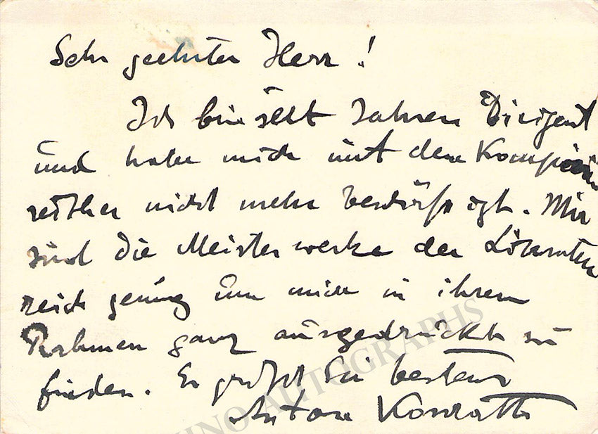 Autograph note on a card signed by him, with no date indicated, stating that he has been working as a conductor for years and he is not involved anymore in composing.  Size is 4.7 x 3.4 inches, in overall very good condition.
