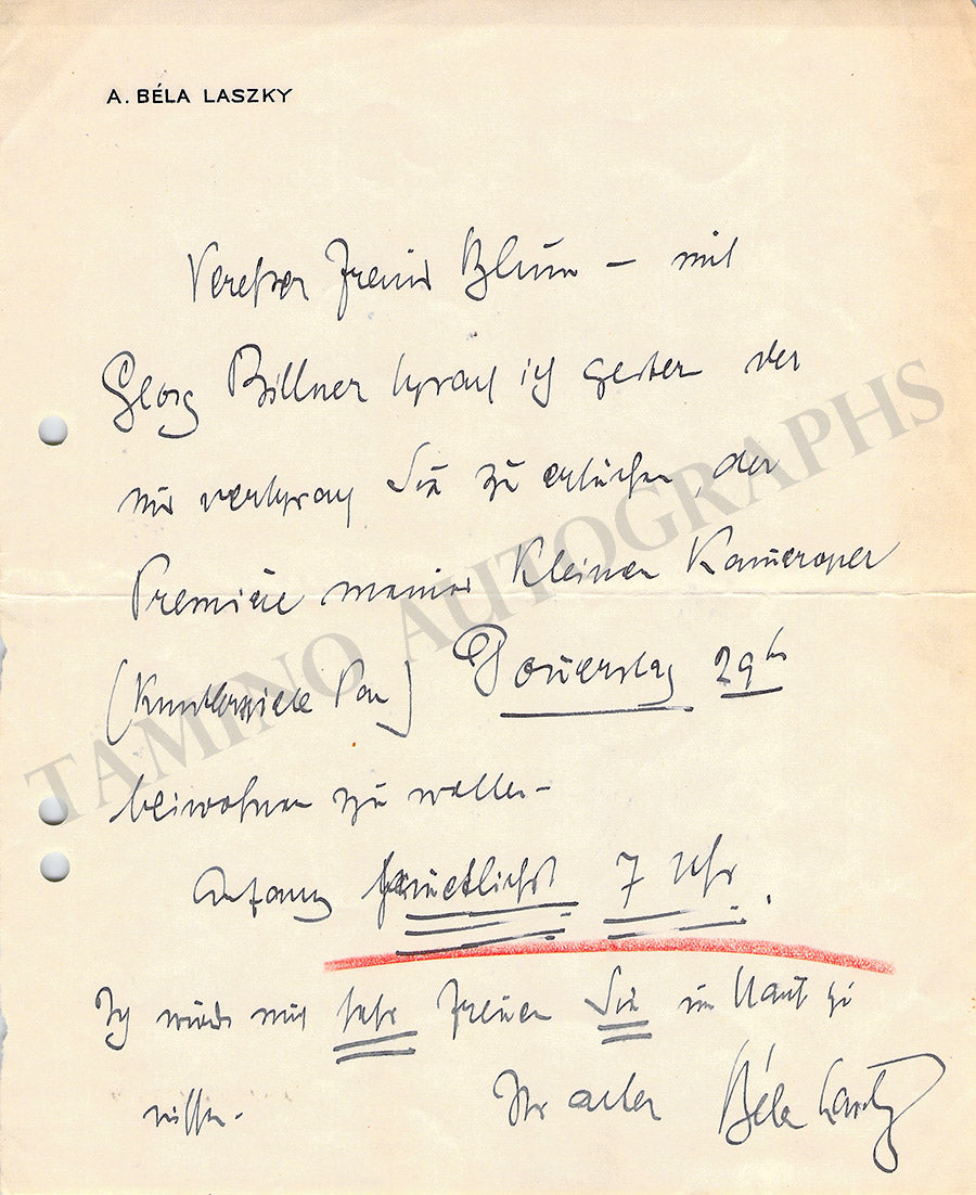 Autograph note in German signed by him, no date, to a friend, making arrangements for a meeting with Georg Billner. Size is 7 x 8.5 inches, 1 page, storage holes, central fold, letterhead, in overall very good condition.