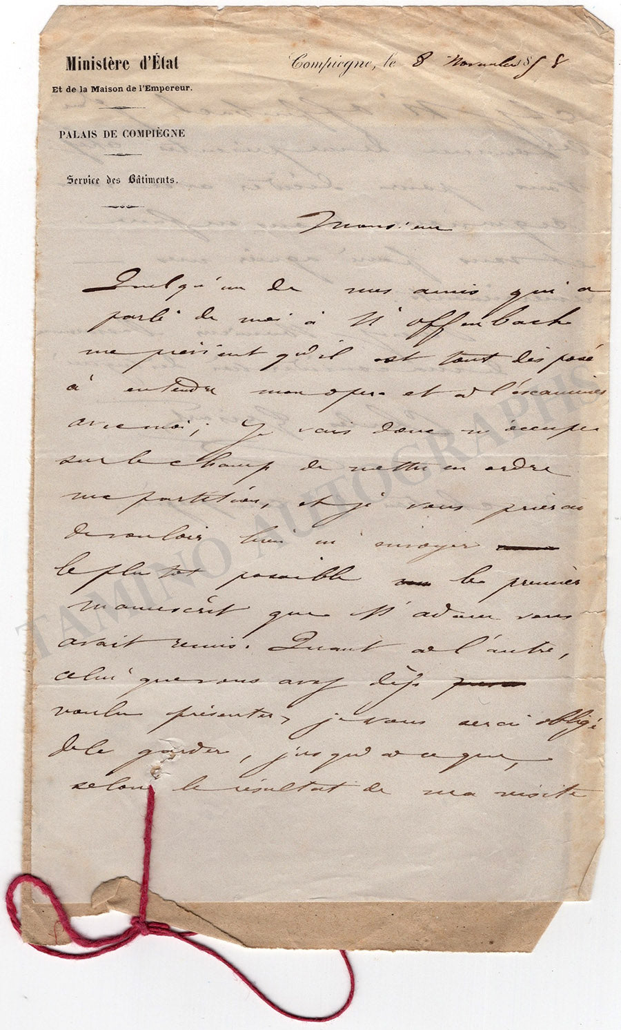 Two autograph letters in French signed by him: one dated in Compiègne, November 8, 1858, and the other one from 1880 ca. Letters concern music publishing and acquaintances, one letter is addressed to the director of the Théâtre des Folies-Dramatiques in Paris Victor Blandin (1824-1898).