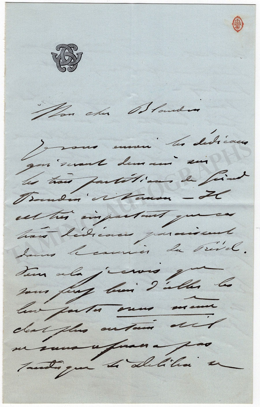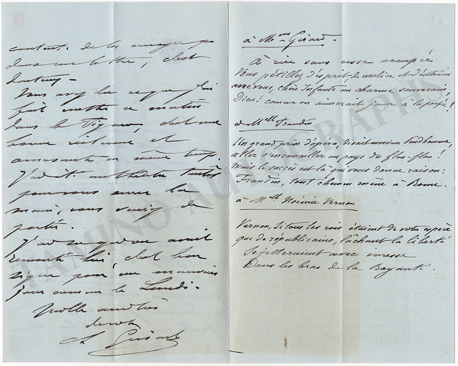 We report two extracts as a sample: “…je vous envoi les dédicaces qui seront demain sur les trois partitions de Sophie Frandin et [Noémie]Vernon - Il est très important que ces trois dédicaces paraissent dans le courrier de Prével…”. ; “…Quelqu’un de mes amis qui a parlé de moi à M. Offenbach me previent qu’il est tout disposé à entendre mon opéra et à l’examiner avec moi…”.